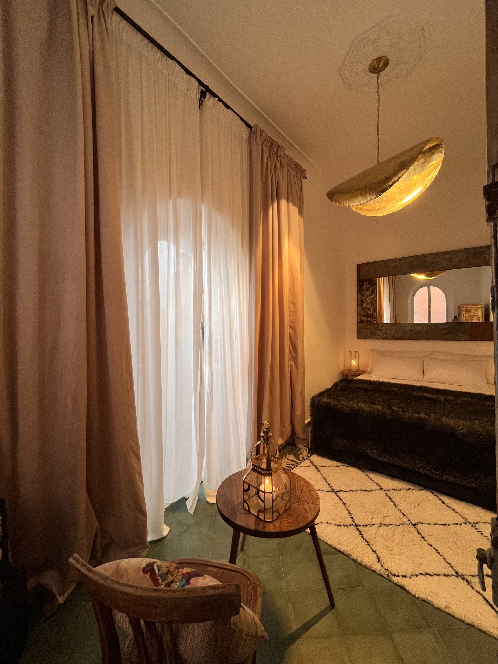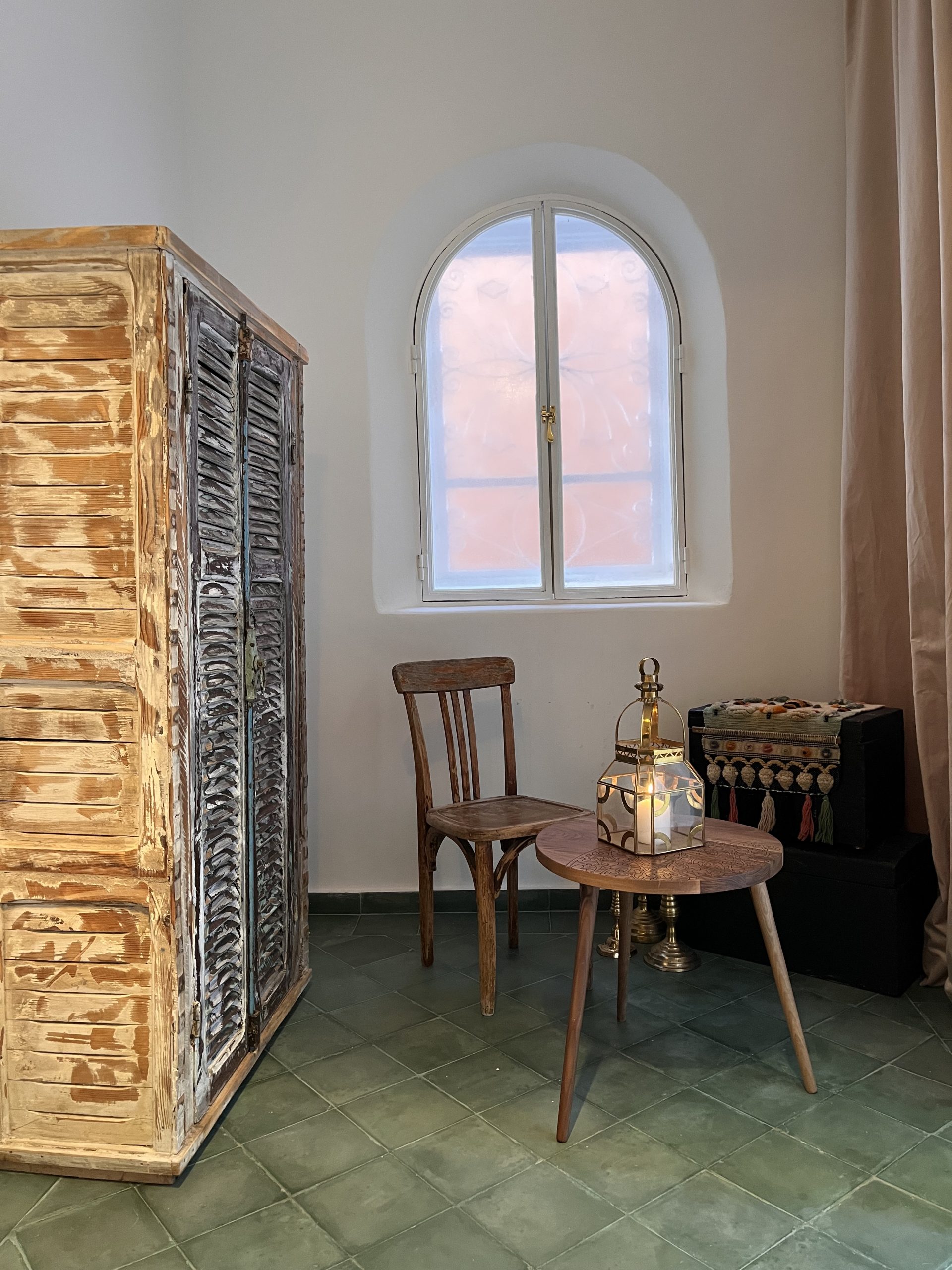Plongez dans les profondeurs du vert, couleur de la vie et des oasis luxuriantes, en entrant dans l’univers de Zaynab Nefzaouia. Conteuse et écrivaine mystique, elle inspire un espace où la nature et la narration fusionnent. Cette chambre est un voyage dans les vallées fertiles de l’âme berbère.