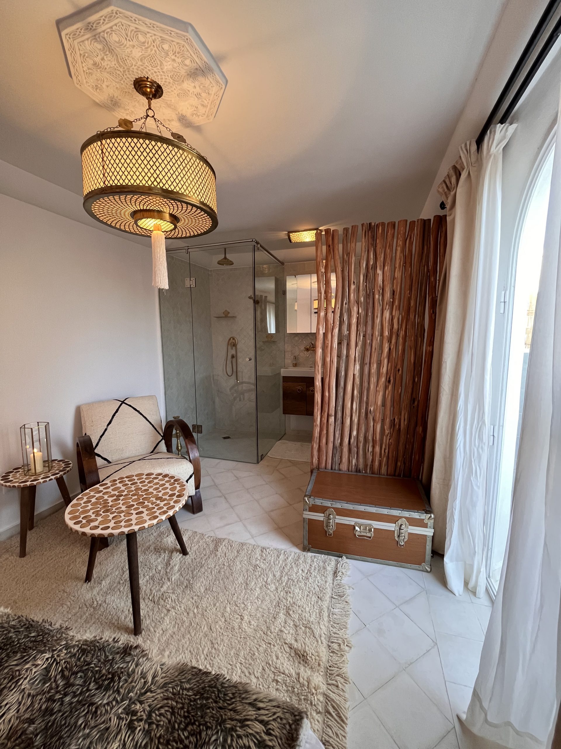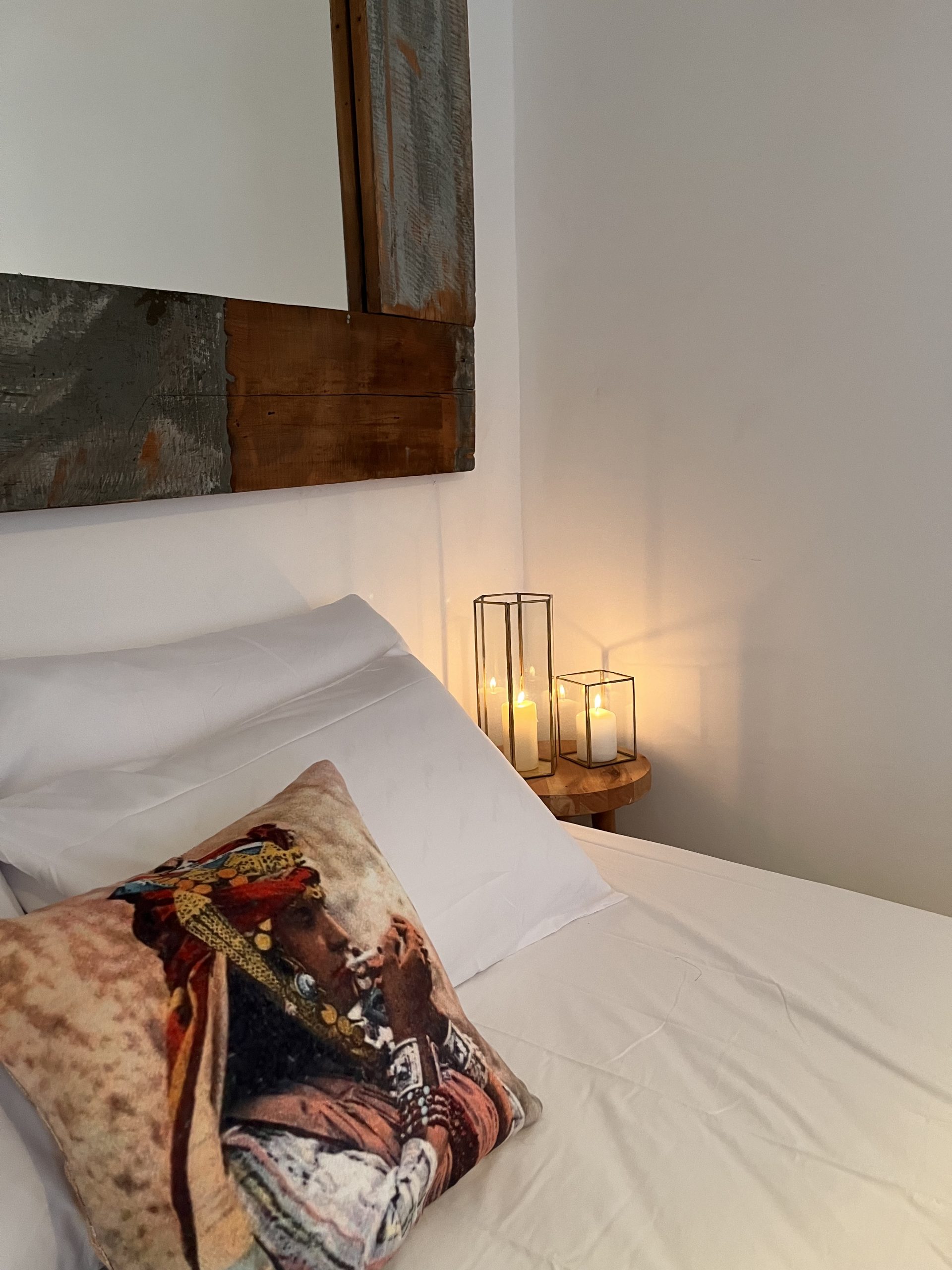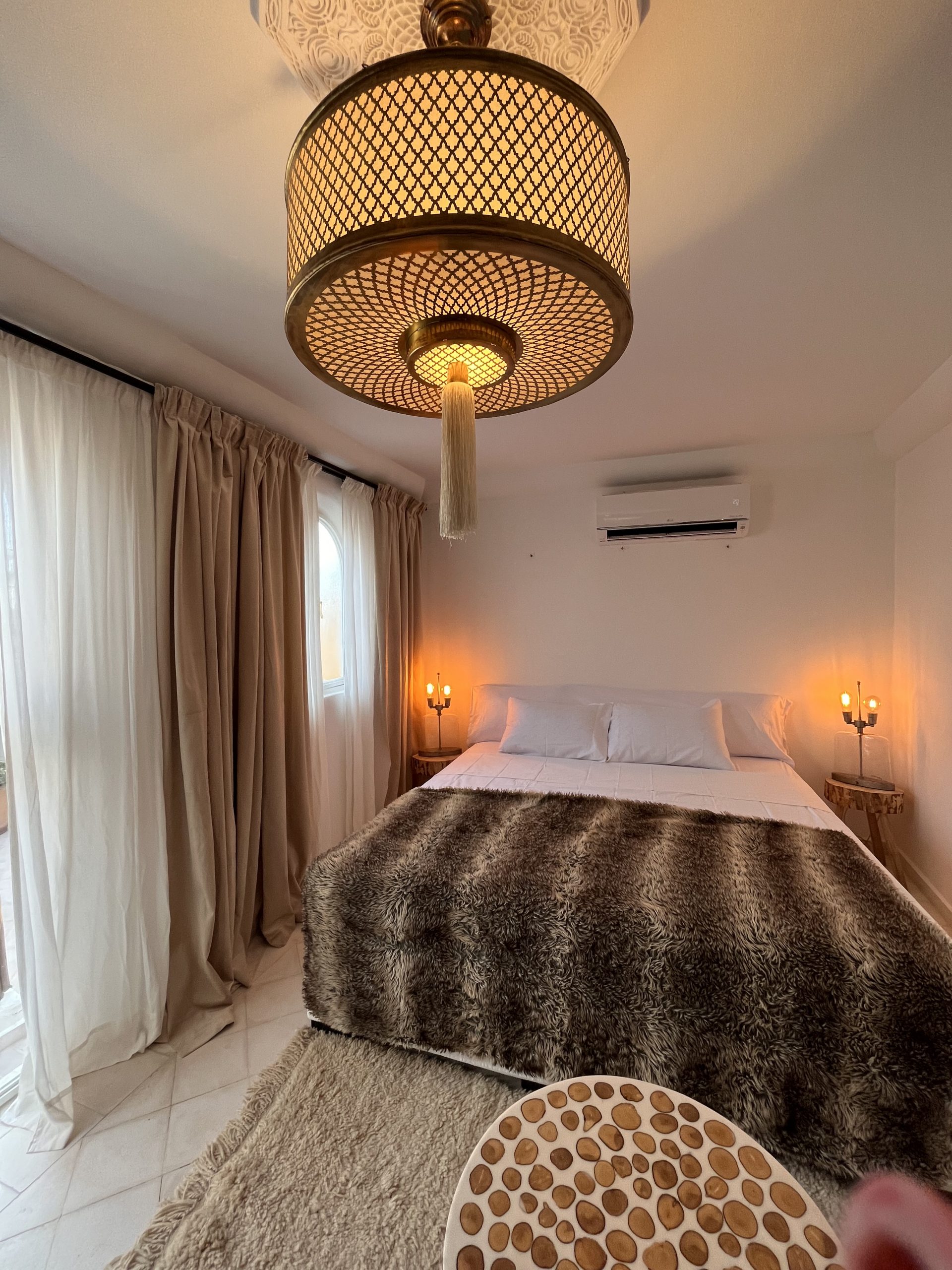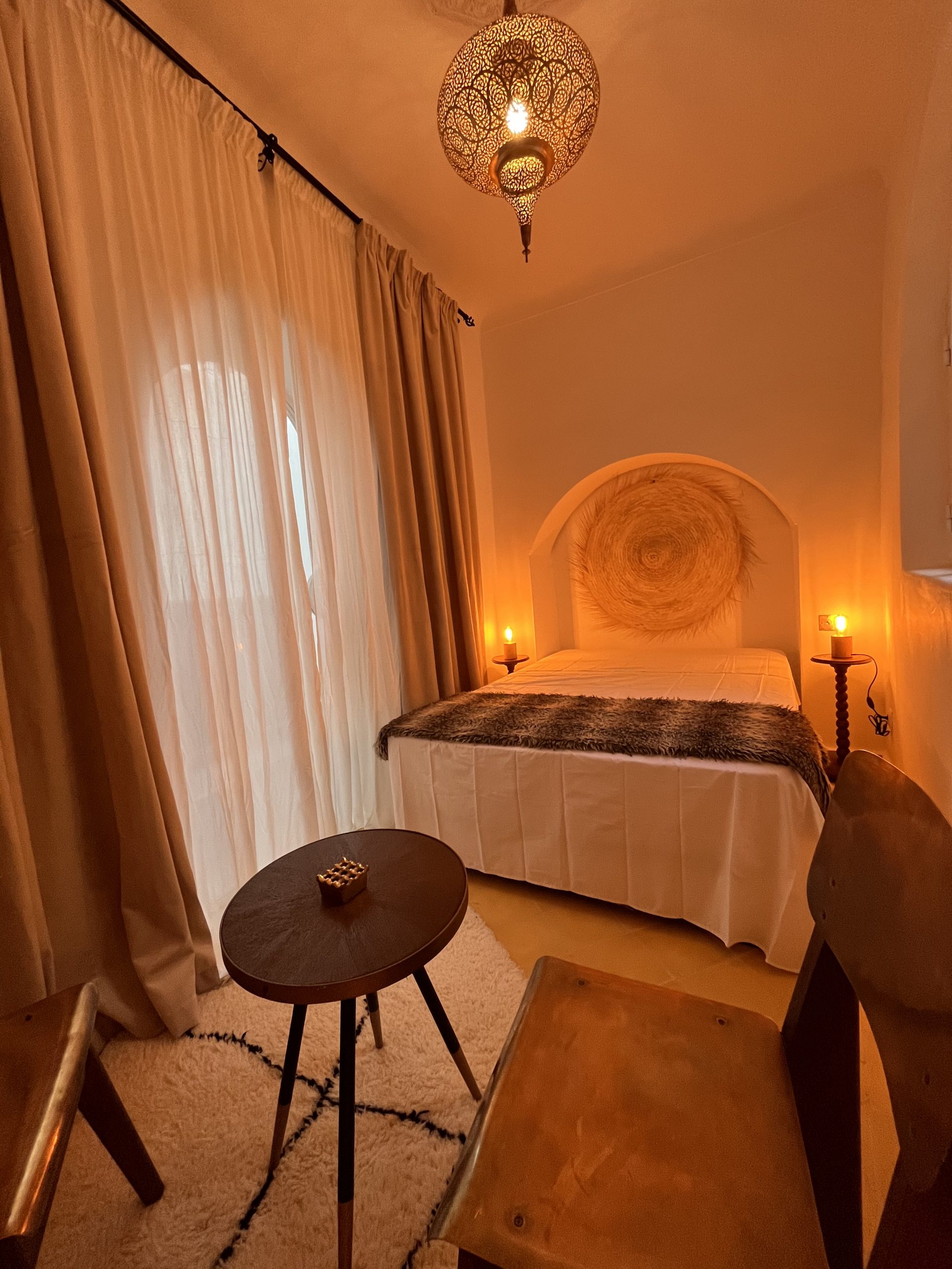 Dans la pureté du blanc s’étend le royaume de Kahina, évoquant la clarté du désert sous la lueur de la lune. Cette chambre est un sanctuaire de paix, inspiré par la reine guerrière du désert, symbole de résistance et d’élégance intemporelle. Ici, chaque souffle vous rappelle la majesté d’un esprit indomptable.