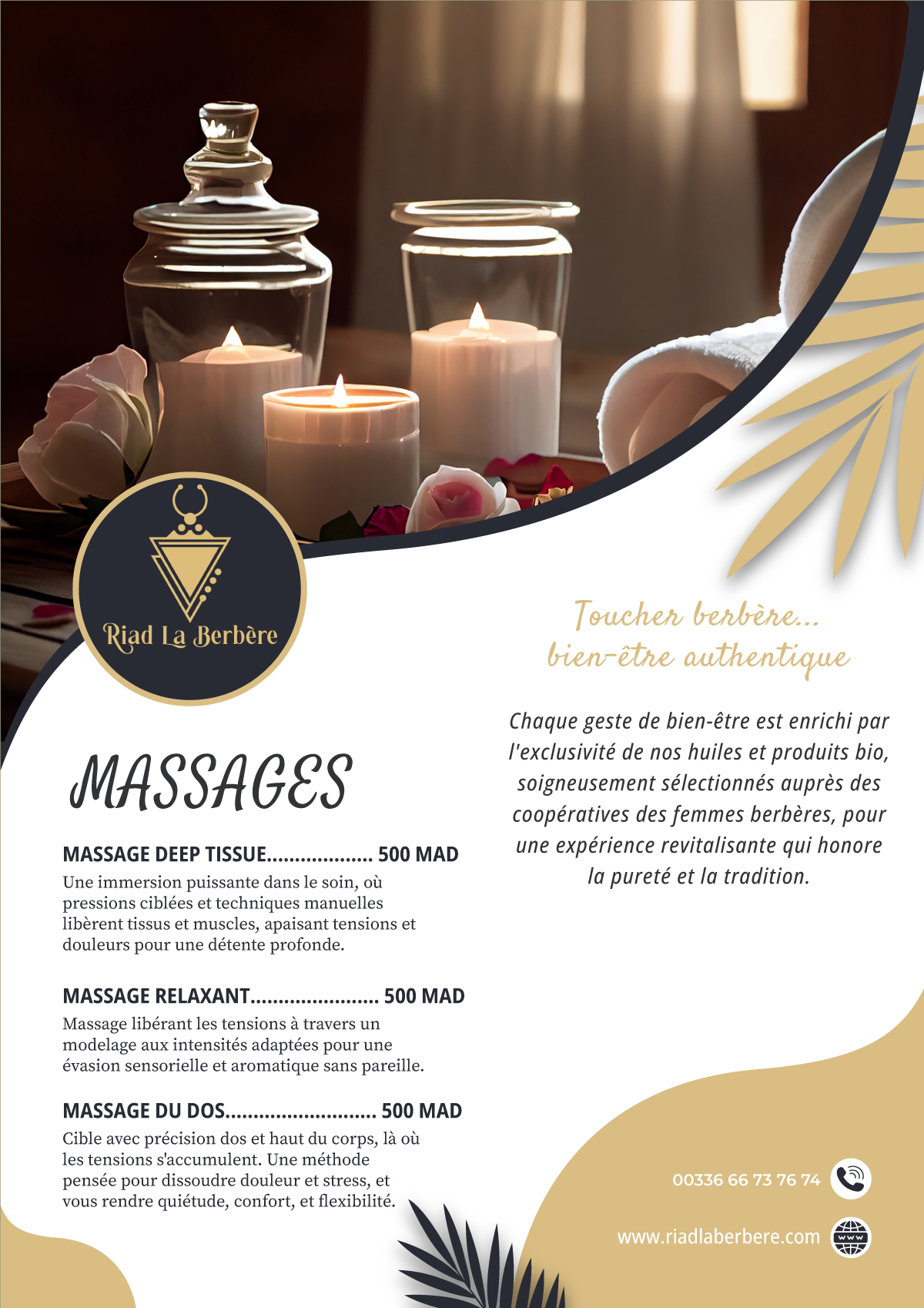 - Massages traditionnels marocains dans le Riad, utilisation de produits et huiles naturelles issues des coopératives des femmes berbères de l’Atlas : 500 DH/heure